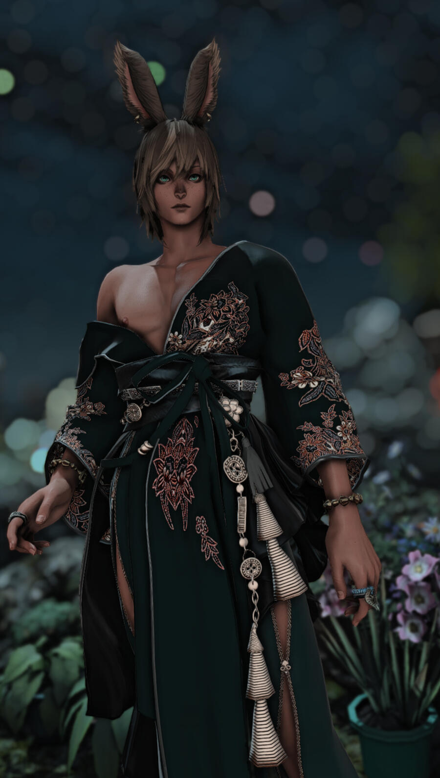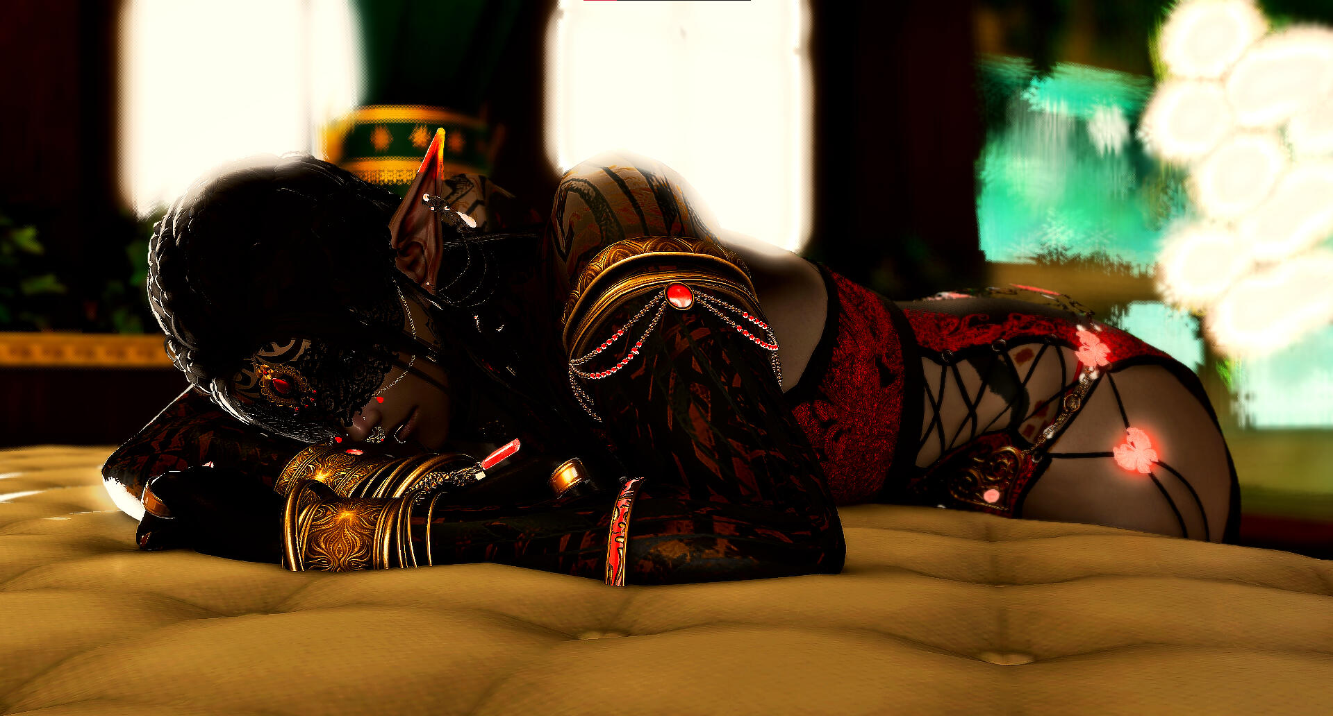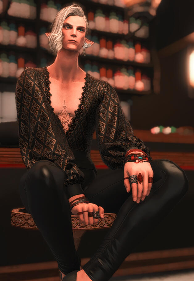 The Blackbird is a lithe beauty of dark hair and sea glass colored eyes that he uses to seduce would-be clients. Catlike and graceful, this elezen is often found lounging in the laps of those who pique his interest. With a penchant for the indecent and a drive to slake his insatiable carnal appetites, the Blackbird is just as quick to please as he is to tease. He is content to serve those of any gender, so long as there is some semblance of chemistry.Rates: